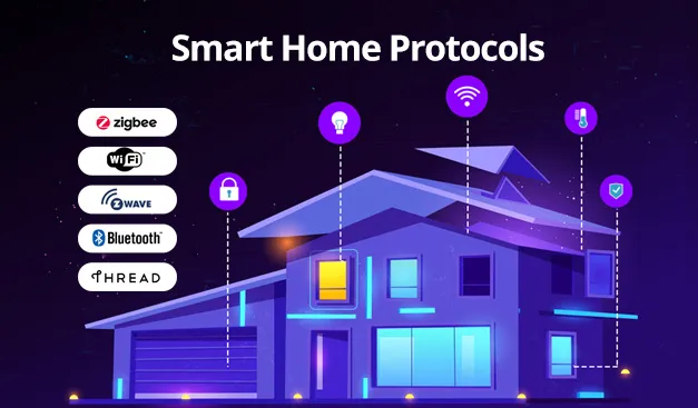 - Zigbee – šiuo protokolu dirba didžioji dalis namo daviklių, kurie yra maitinami baterijomis. Reikalas tame, kad komunikacija Zigbee protokolu yra žymiai mažiau imli energijai nei Wi-Fi ir tai turi tiesioginę įtaką maitinimo elementų tarnavimo laikui. Šiuo protokolu dirba visi langų/durų atidarymo, temperatūros ir drėgmės, apšvietimo, dūmų ir vandens nuotėkio jutikliai ir apsaugos sistemos vidinės sirenos. Tačiau šis protokolas turi žymiai mažesnę sklaidos zoną bei jautrus visokiems trukdžiams. Todėl dalis išmanių rozečių taip pat dirba Zigbee protokolu ir atlieka papildomo maršrutizatoriaus funkciją kaip ir sirenos, kurios turi dvigubą maitinimą, t.y ir maitinimo elementai ir elektros tinklas tuo pačiu metu. Kaip jau supratote, kad dažnu atveju tie Zigbee įrenginiai, kurie maitinami nuo elektros tinklo, gali būti maršrutizatoriais, kas kompensuoja sklaidos trūkumus ir užtikrina Zigbee tinklo gyvybingumą