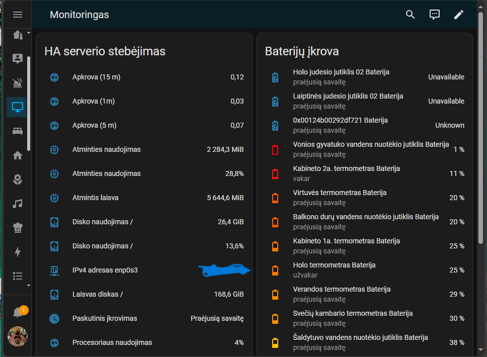 Rašant praeitą įrašą apie šį projektą, kur apžvelgiau, kas buvo nuveikta per pirmus metus, supratau, kad Home Assitant tapo namo stebėjimo ir valdymo centru. Paties namo būklę stebi ir valdo virš šimto prietaisų ir visokių jutiklių. Visokios integracijos, automatizacijos, pagalbininkai (virtualūs jutikliai ar jungikliai bei prietaisų grupės) tą skaičių dar padvigubina. Ir visa tai yra valdoma vienintelio serverio. Tad darosi aišku, kad tokio serverio veiklos įvairių parametrų darbo stebėjimas tampa kritiniu.